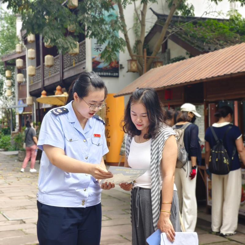 临近“国庆”“中秋”双节,休宁县齐云山景区为给游客提供更优质的度假体验,全新升级打造“云逍遥街”。休宁县税务局在现场开展税收宣传,图为税务干部在向游客和商户介绍社保“掌上办”及诚信经营、依法纳税等知识,倡导广大纳税人依法诚信纳税。