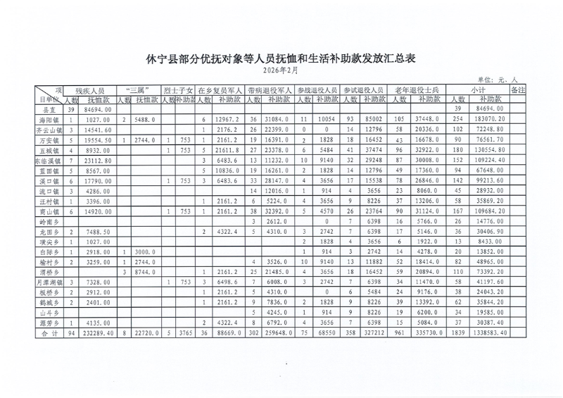 休宁县退役军人事务局2026年2月份优抚对象抚恤补助资金管理和使用分配结果