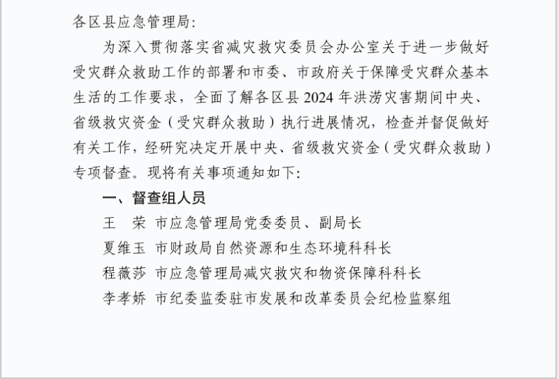 关于开展中央、省级自然灾害救灾资金(受灾群众救助)专项督查工作的通知