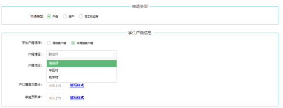 “非海阳镇户籍”报名需选择户籍辖区(车田村,轮车村)填写户籍地址,上传“户口簿首页”和“学生页图片”。