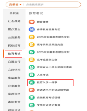 皖事通APP中进入“教育入学一件事”入口,(“更多服务”->“教育考试”->“教育入学一件事”)