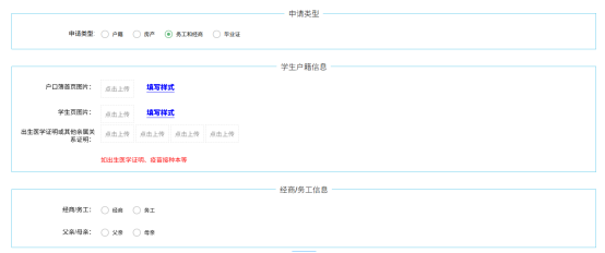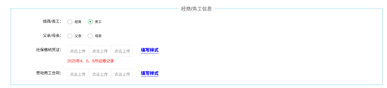 务工和经商信息:若父母为务工需上传“社保缴纳凭证”和“劳动用工合同”。