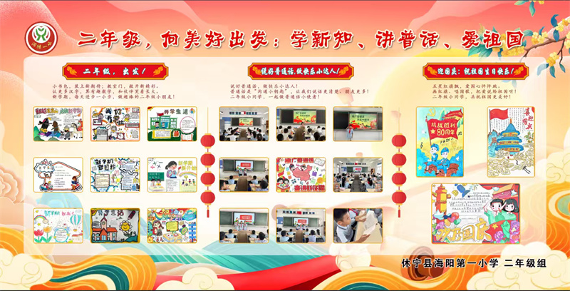 一年级“好习惯,天天做,人人赞!”展板,以向日葵造型照片墙和多板块内容,呈现学生在课堂、礼仪、安全等方面的良好习惯养成。二年级“向美好出发:学新知、讲普通话、爱祖国”展板,手抄报与课堂活动照片,展现学生学新知、推普及迎国庆的热情。