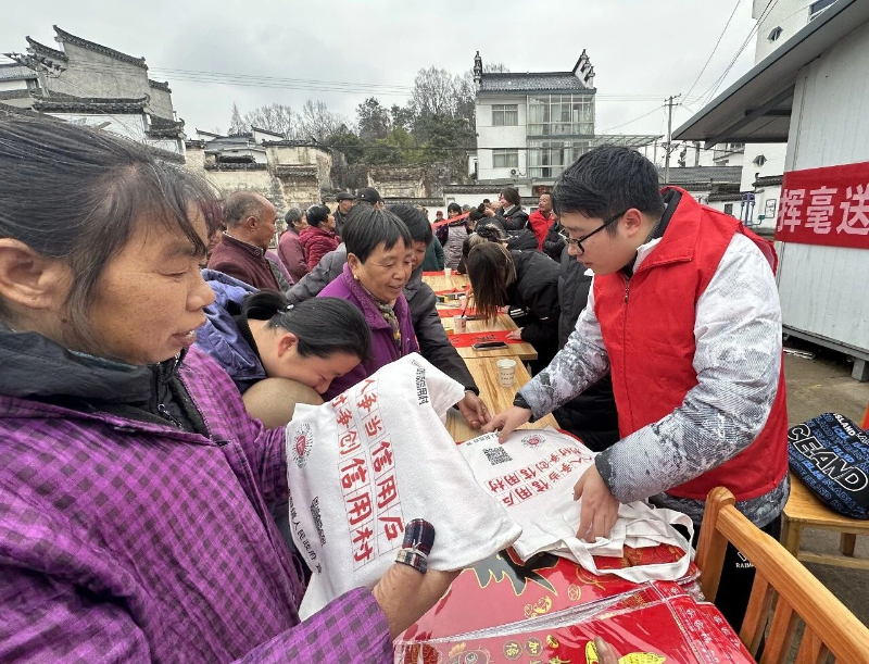 活动现场热闹非凡,工作人员首先围绕“信用礼遇”政策进行宣讲,解读信用评级标准等核心内容,并收集村民对信用村建设的意见建议。随后,书法志愿者们凝神挥毫,将新春祝福与诚信文化融入笔墨,一副副字迹工整、寓意吉祥的春联跃然纸上,“春临大地福满门,信润乡村喜盈庭”等春联深受村民喜爱。大家有序排队领取春联、福袋,现场气氛热烈。同时,宣传咨询台前,镇村干部与金融村官耐心为村民解答礼遇政策、信用贷款等疑问,发放宣传资料60余份。
