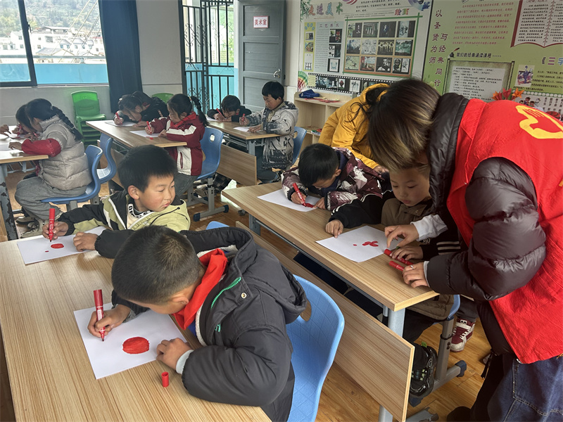 美术课上,志愿者夏天老师以新年为切入点,带领同学们画了五个可大可小、可高可低的红灯笼,鼓励学生不受拘束大胆的作画,用画笔表现艺术的自由。