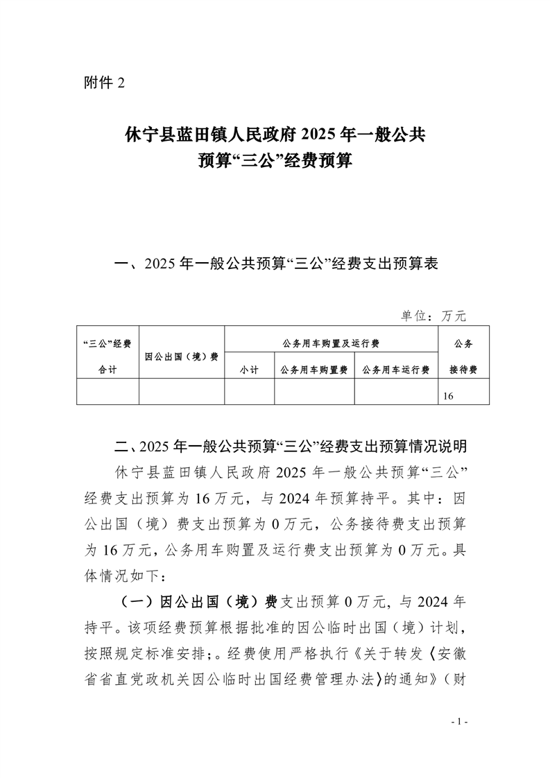 休宁县蓝田镇人民政府 2025 年一般公共预算“三公”经费预算