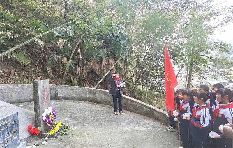 4月3日上午,党员教师佩戴党员徽章,少先队员身着校服、佩戴红领巾,怀着崇敬的心情来到对越自卫反击战中英勇牺牲的余顺利烈士纪念碑前,在庄严肃穆的烈士纪念碑前,祭扫仪式正式开始。