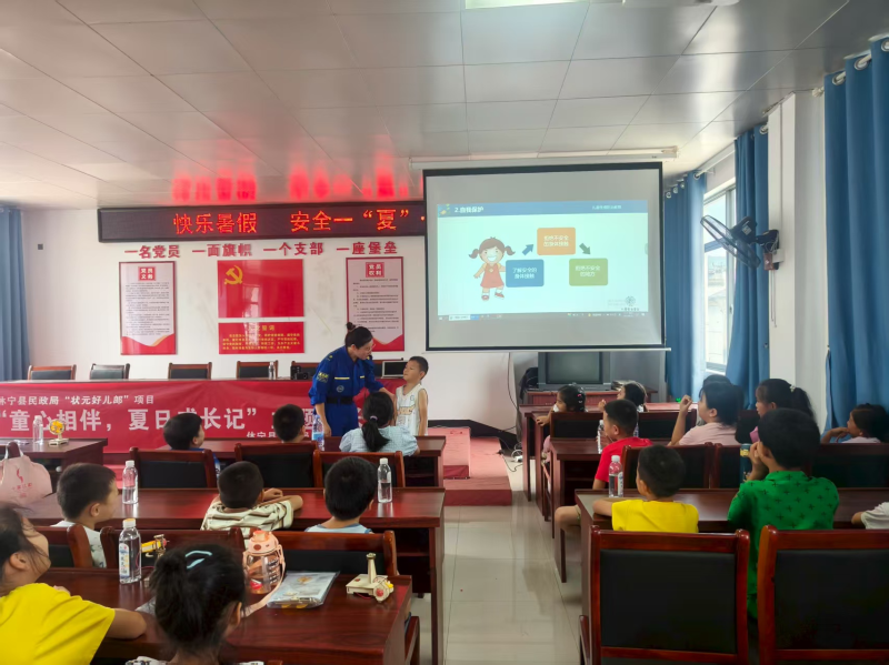 活动中,特邀的休宁县蓝天救援队队员结合生动案例,围绕防溺水、安全用电、交通安全、自我保护等暑期安全重点,为孩子们带来一堂深入浅出的安全教育课。讲师通过互动问答、情景模拟等方式,向孩子们讲解如何辨别危险、预防事故及正确求助,现场氛围活跃,孩子们踊跃参与,在轻松互动中掌握安全知识。随后,普法志愿者还开展了未成年人保护法、宪法等普法宣传。