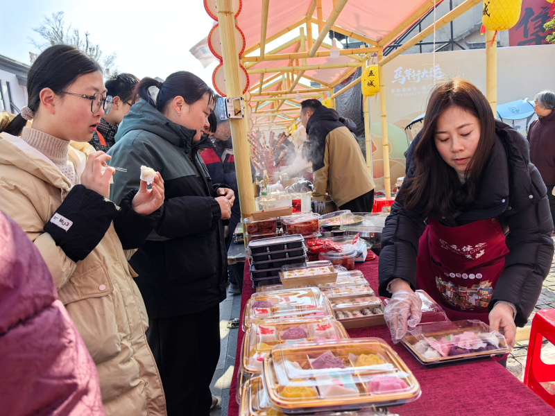 尝过非遗头味,市集街巷的特色小吃便是逛集途中的惊喜。沿街排布的美食小铺里,地道徽州风味扎堆亮相,香气裹着年味扑面而来。必尝头牌当属刚出锅的五城馄饨,薄如蝉翼的馄饨皮裹着鲜美的肉馅,在沸水中翻滚片刻便浮起,汤头撒上葱花,一口下去皮薄馅嫩、汤鲜汁美,暖意在舌尖蔓延。不远处的米糕摊位前,蒸屉掀开的瞬间,蓬松柔软的米糕裹着米香四散开来,入口清甜软糯,细腻的口感里藏着徽州人对甜食的精致追求,表面点缀的喜庆图案,更是将传统审美与美好祝愿完美融合。