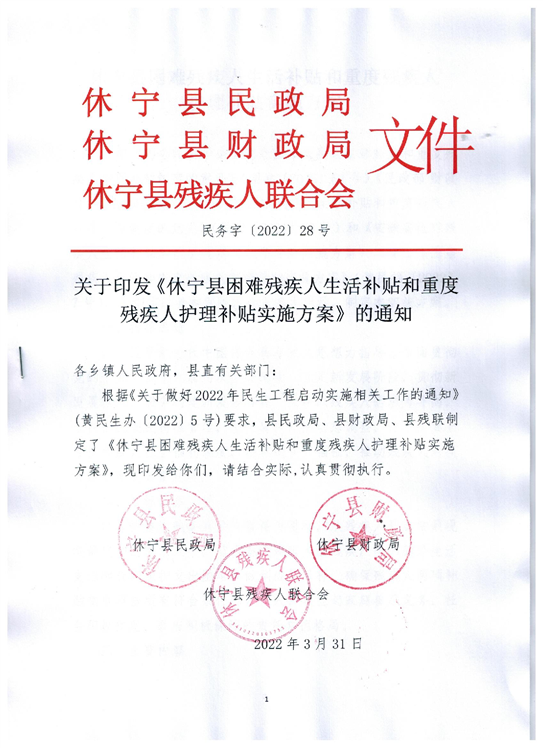 关于印发《休宁县困难残疾人生活补贴和重度残疾人护理补贴实施方案》的通知