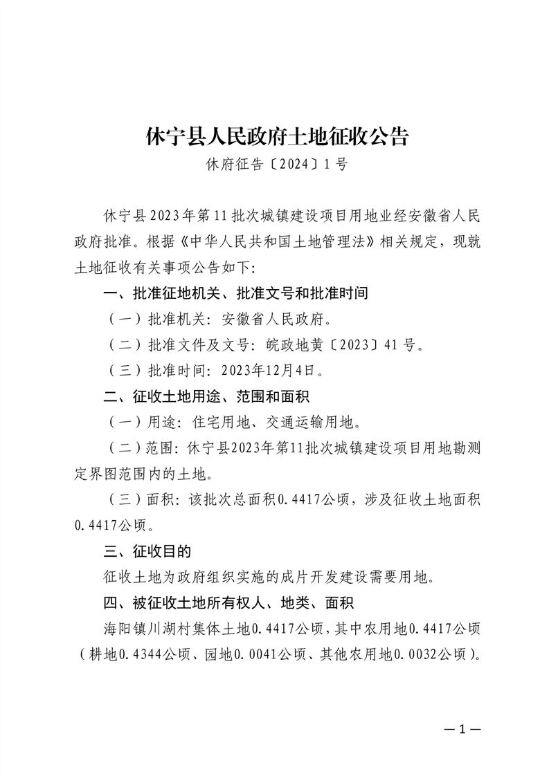 休宁县人民政府土地征收公告 休府征告〔2024〕1号