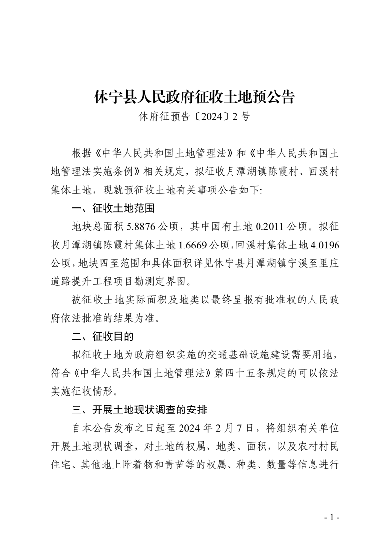 休宁县人民政府征收土地预公告 休府征预告〔2024〕2号