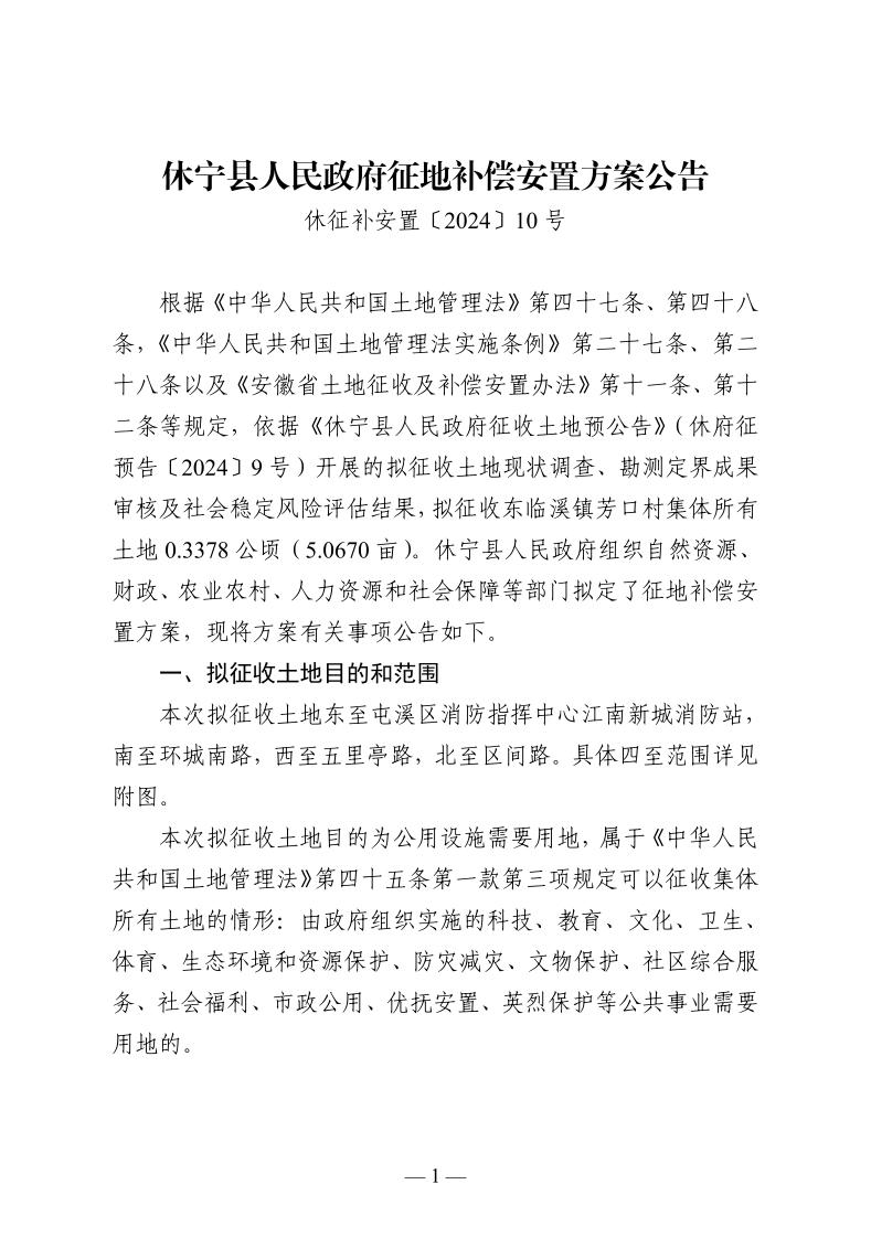 休宁县人民政府征地补偿安置方案公告 休征补安置 〔2024〕 10号