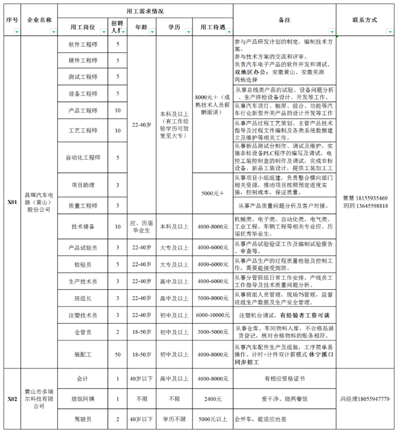 【就业驿站】休宁县2024年11月用工需求岗位信息表