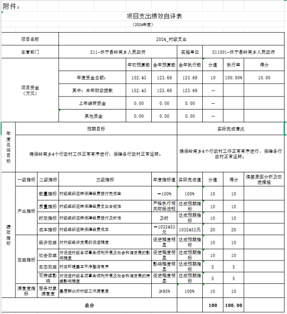 2024村级支出项目绩效自评综述:根据年初设定的绩效目标,项目绩效自评得分为100分。全年预算数为123.69万元,执行数为123.69万元,完成预算的100%。项目绩效目标完成情况:1.产出指标完成情况分析。资金及时拨付到位。2.效益指标完成情况分析。该项目为常年项目,该费用为 2024 年当年的费用,确保年限为 1 年。3.满意度指标完成情况分析。群众满意度高达100%。
