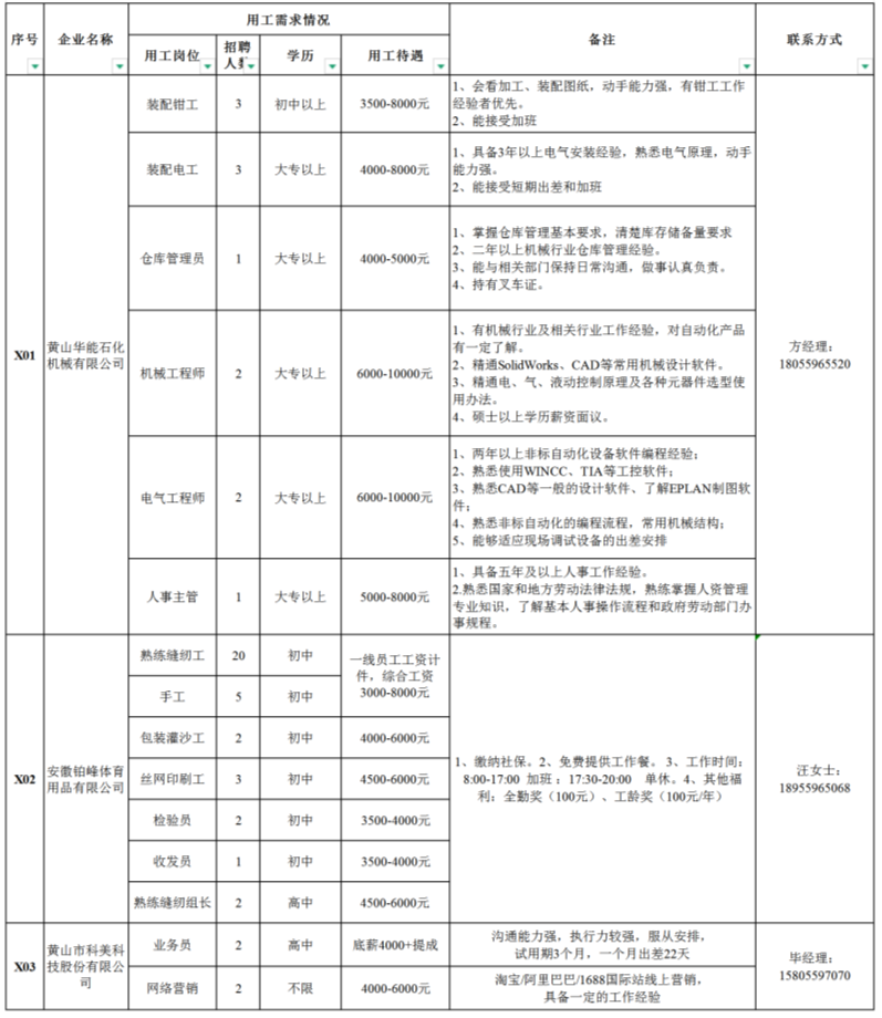 4.招聘流程:登录休宁县人民政府网公示公告栏或关注“休宁人社”微信公众号查看岗位信息表,并自行与意向企业的联系人联系。