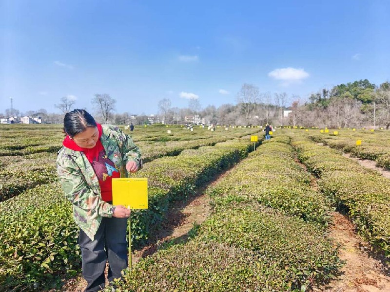 活动现场,党旗飘扬、分工明确,党员干部带头冲锋在前,与志愿者协同配合,严格按照绿色防控技术规范,有序开展诱虫黄板扦插作业。大家细致完成插签、固定、定位等全流程操作,确保每一块黄板都精准安置在茶垄间,形成一道守护茶树的“生态防线”。
