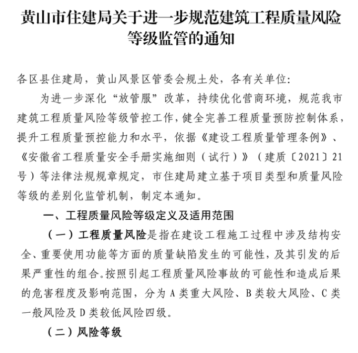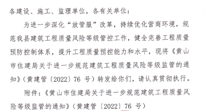 【优化营商环境】休宁县住建局关于转发《黄山市住建局关于进一步规范建筑工程质量风险等级监管的通知》的通知