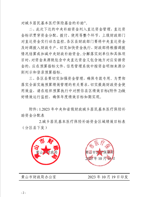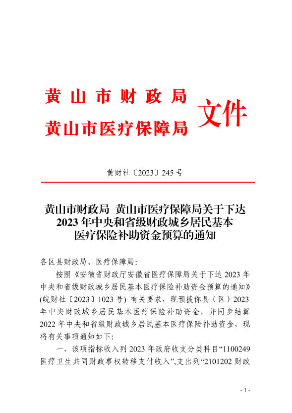 黄山市财政局黄山市医疗保障局关于下达2023年中央和省级财政城乡居民基本医疗保险补助资金预算的通知