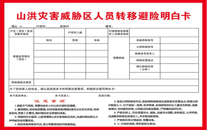 转移安置组由乡、村两级干部和网格员组成,负责将地质灾害隐患点和山洪威胁区内所有农户按预定路线转移至安置点,对应分级响应,落实梯次转移,做到应转尽转,同时做好安置点生活保障。