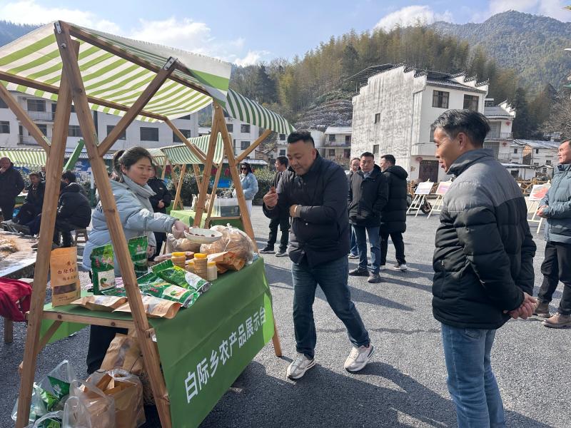 协议落笔之际,白际乡广场的农特产品展示交流区同步开启,皖浙山区各类特色好物悉数登场。安徽三乡镇主打皖南原生态风味:白际乡的红薯干软糯甘甜,野葛粉、高山茶、野蜂蜜等天然绿色食品;长陔乡“长陔三宝”火腿、笋干、山芋枣,香气浓郁,笋干尤具炭火烘烤特色;狮石乡高山红茶茶香清冽,农家蜂蜜清甜醇厚,尽显高山生态馈赠。浙江三乡镇农产各具亮点:姜家镇笋干酱、牛肉酱鲜辣够味,金丝黄菊尽显千岛湖生态优势;汾口镇带来淳山淳水有机大米和微酿米酒;中洲镇则有山茶油、腊肉、千岛湖鱼干及农家日晒面等,油香纯正、肉香醇厚,鱼干与日晒面尽显湖乡与农家风味。展区现场,工作人员现场讲解,群众驻足试吃订购,现场氛围热烈。