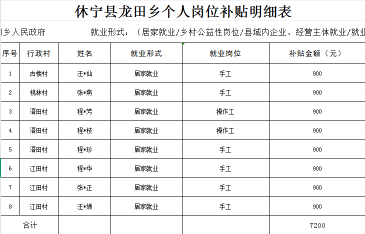 【帮扶资金】龙田乡一季度居家就业补贴明细表