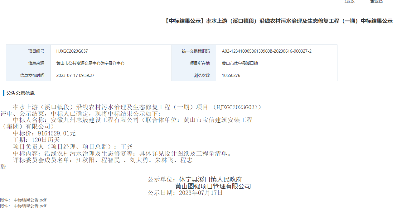 【中标结果公示】率水上游(溪口镇段)沿线农村污水治理及生态修复工程(一期)中标结果公示