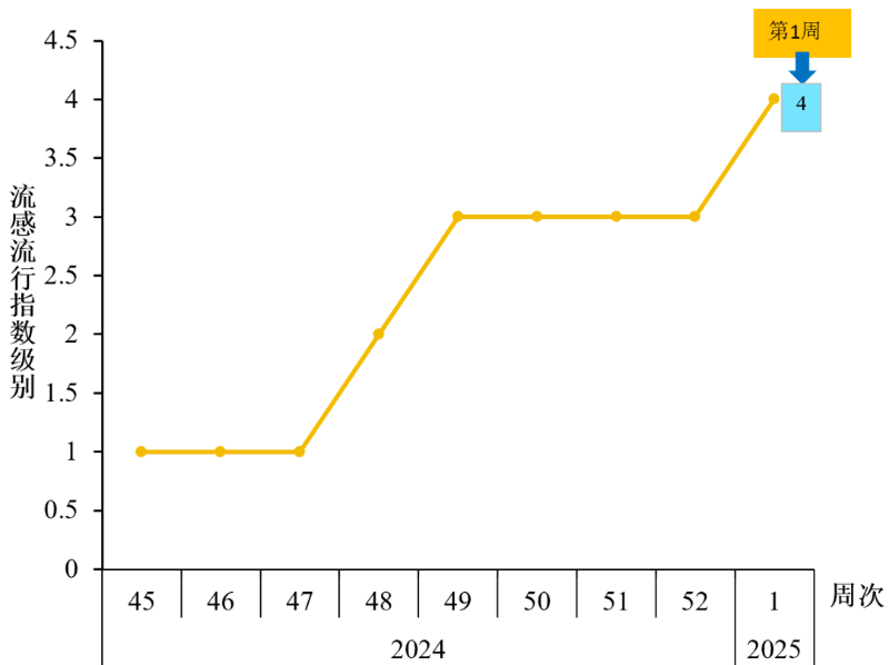 目前安徽省流感流行等级为第4级(1级为风险最低,5级为风险最高),流感病例明显高于非流行期,流感流行强度较高,处于流感流行期。监测到流感病毒以甲型H1N1为主。预计2025年第1周(2024年12月30日至2025年1月5日)流感活动水平较高,感染流感病毒风险较高。