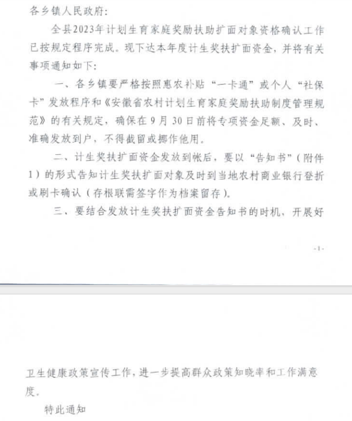 【政策文件】关于发放2023年计生奖励扶助扩面资金的通知