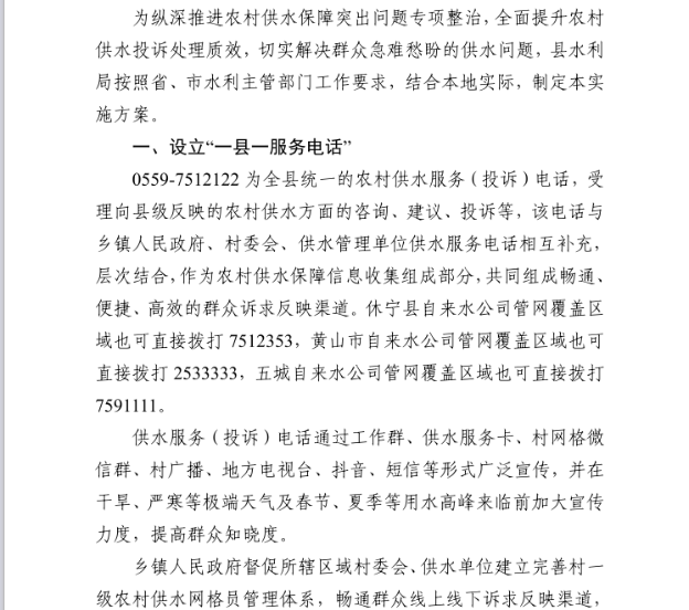 关于印发《休宁县提升农村供水投诉处理质效实施方案》的通知