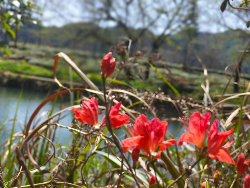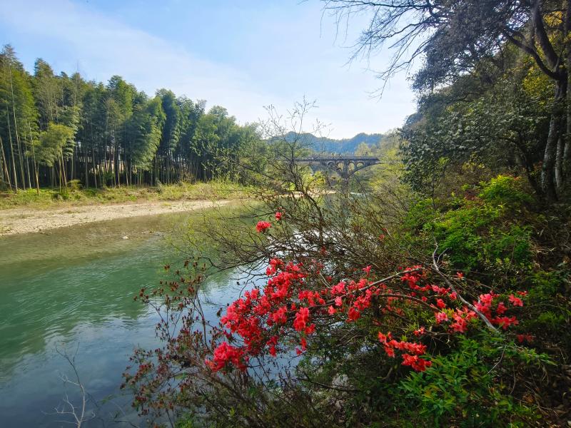 河畔,杜鹃花肆意绽放,似燃烧的火焰,为青山绿水添上浓墨重彩的一笔。绿水悠悠流淌,与娇艳的杜鹃相映成趣,每一眼都是大自然精心绘制的画卷。远处,竹林郁郁葱葱,微风拂过,竹影摇曳,沙沙声似在诉说着流口的温柔。古朴的桥梁横跨河面,连接着两岸的美景,也承载着岁月的故事。