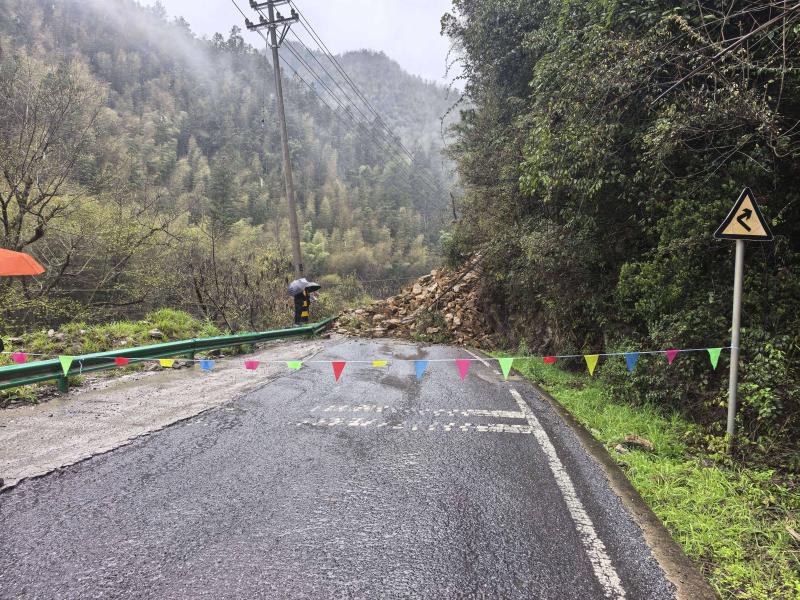 受持续降雨影响,汪村镇回源村道路旁发生山体滑坡,大量石块、泥土滑落至路面,造成道路临时中断。