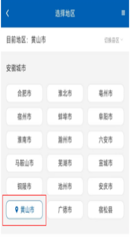在区域选择界面选择“黄山市”,或者直接搜索关键字“入学登记”后点击“教育入学一件事”,选择“黄山市”,进入皖事通报名页面。