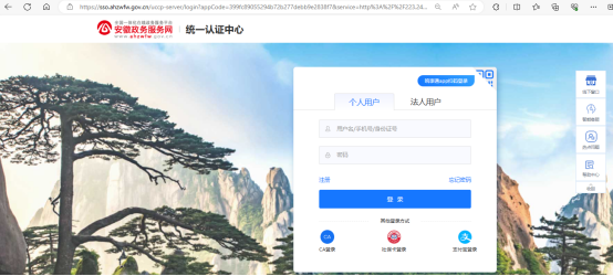 点击“黄山市”入口,跳转至“安徽政务服务网”登录界面,登录申请人自己的皖事通账号后,系统自动跳转至报名首页。