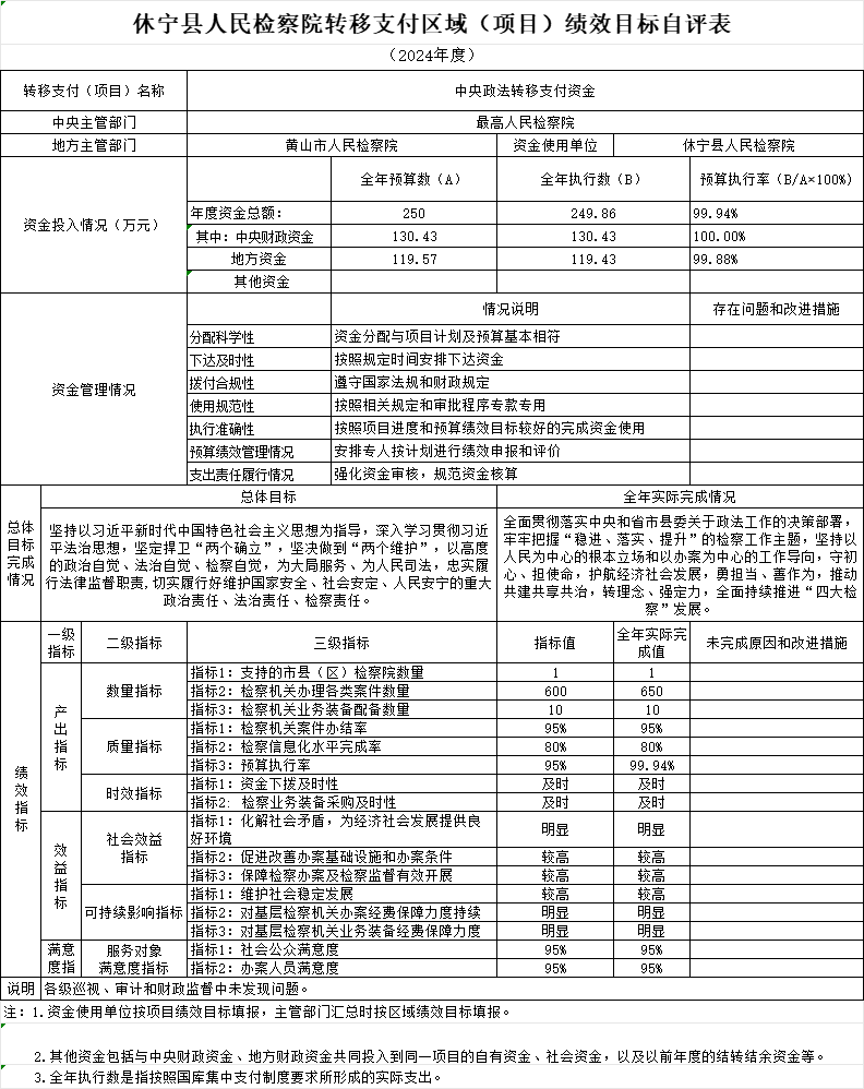黄山市休宁县人民检察院转移支付2024年度绩效自评报告